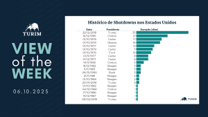 A tabela desta semana apresenta o histórico de shutdowns desde 1976, evidenciando que o mais longo — e também o mais recente — ocorreu durante o primeiro mandato de Donald Trump, estendendo-se por pouco mais de um mês. As expectativas do mercado indicam que a paralisação em curso pode se prolongar por cerca de duas semanas.